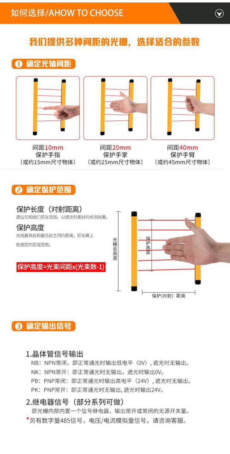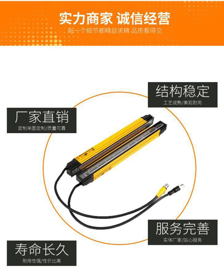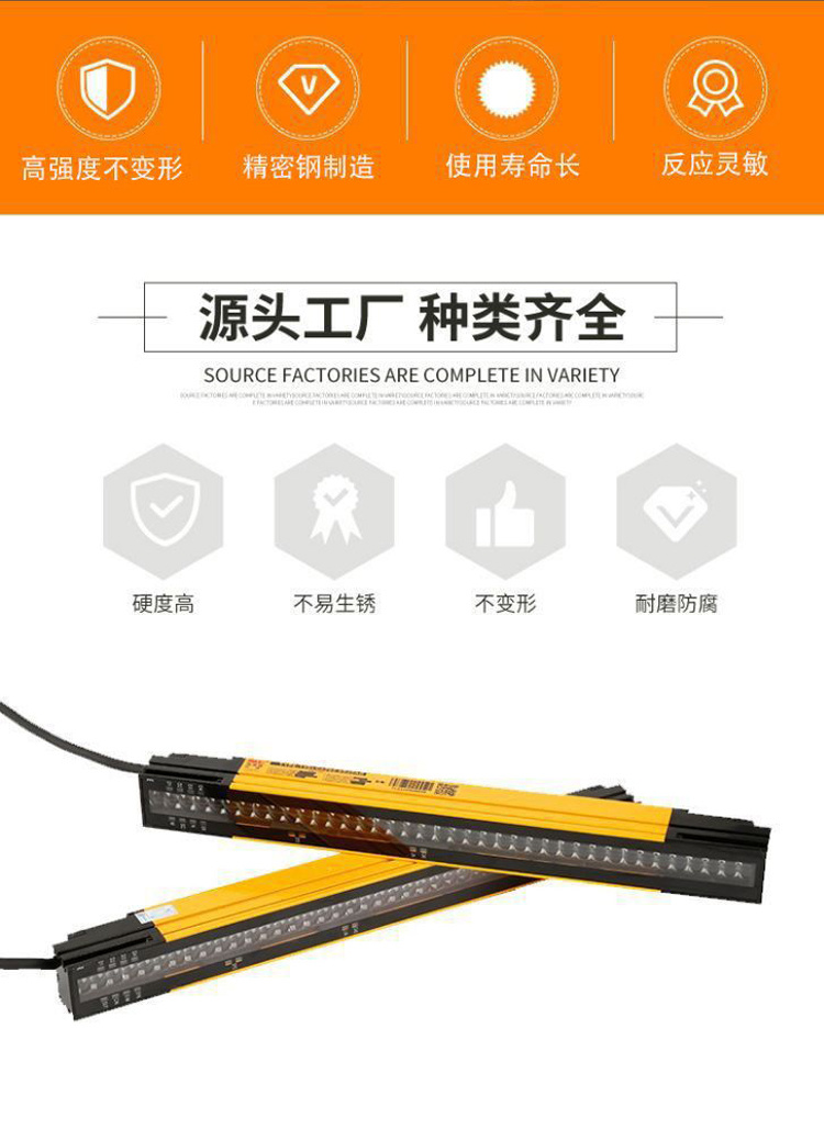 The grating adopts CPU self-test. When the grating itself fails (such as: light source is not synchronized, light source intensity is insufficient, light projection drive circuit error, main control circuit error, cable problem, and receiving drive circuit error, main control circuit error, CPU error), the grating can ensure that no error signal is sent to the controlled device to ensure the safety of the grating.